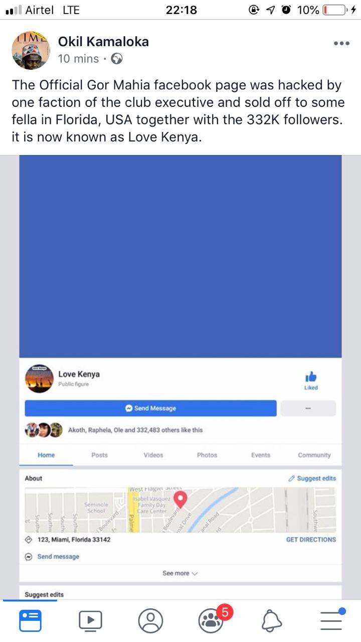 It is reported that Gor Mahia’s official Facebook page was hacked and sold off to a businessman in Florida by a faction of the club’s executive.