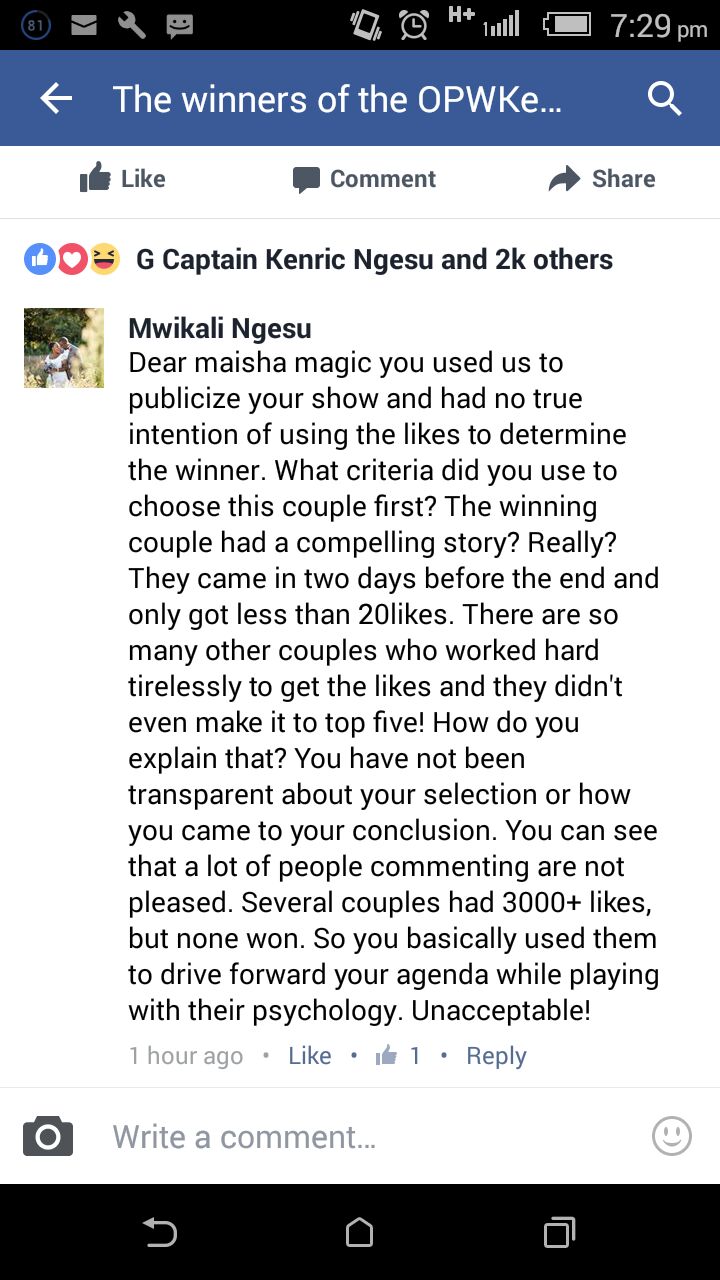 Many couples had thousands of likes but they chose someone with 19 likes who is a relative of the marketing manager at Multichoice Kenya. Nyakundi help us out by blogging about it or taking it to Twitter.