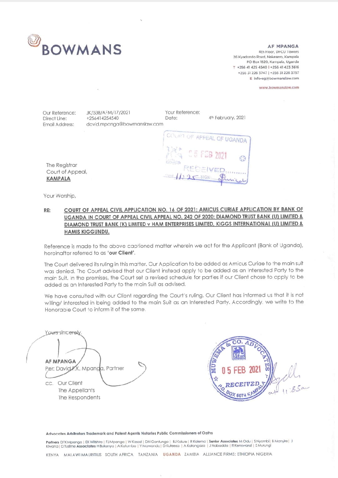 Things are quickly changing as Bank of Uganda finally admits that DTB committed humongous illegalities and runs out of the case after realizing the facts as presented by Ham’s Lawyers. This is a true indicator that the illegality was committed since the regulator who had initially laid a shoulder for DTB to cry on after the High Court Judgement has now made a premature exit from the case whose High Court Judgement was appealed by DTB. We reported earlier this week that the Court of Appeal had dismissed the friend request by Bank of Uganda to offer expert opinion in the Ham Vs DTB case. Their Amicus Curiae application was declined after all the three judges agreed that it was next to impossible for BOU to be impartial in this matter since it had been one of the parties that got directives in the High Court judgement and as such they were not fit to be amicus curiae in this case. In the same line, Ham’s Lawyers informed the court that BOU had already expressed their aggrieved position when they offered to babysit DTB after the High Court Judgement through a press release statement they made which clearly showed their interest in the Ham Vs DTB case. The Court of Appeal instead advised Bank of Uganda to clearly indicate their interest in the Ham Vs DTB case through applying to become a party in the matter. In a letter that we have seen dated 4th February 2021, this position has been declined by BOU indicating that they have dropped their interest in the case. This means that DTB has now been left to battle and carry their own cross for the illegalities committed while carrying out financial business operations in Uganda.
