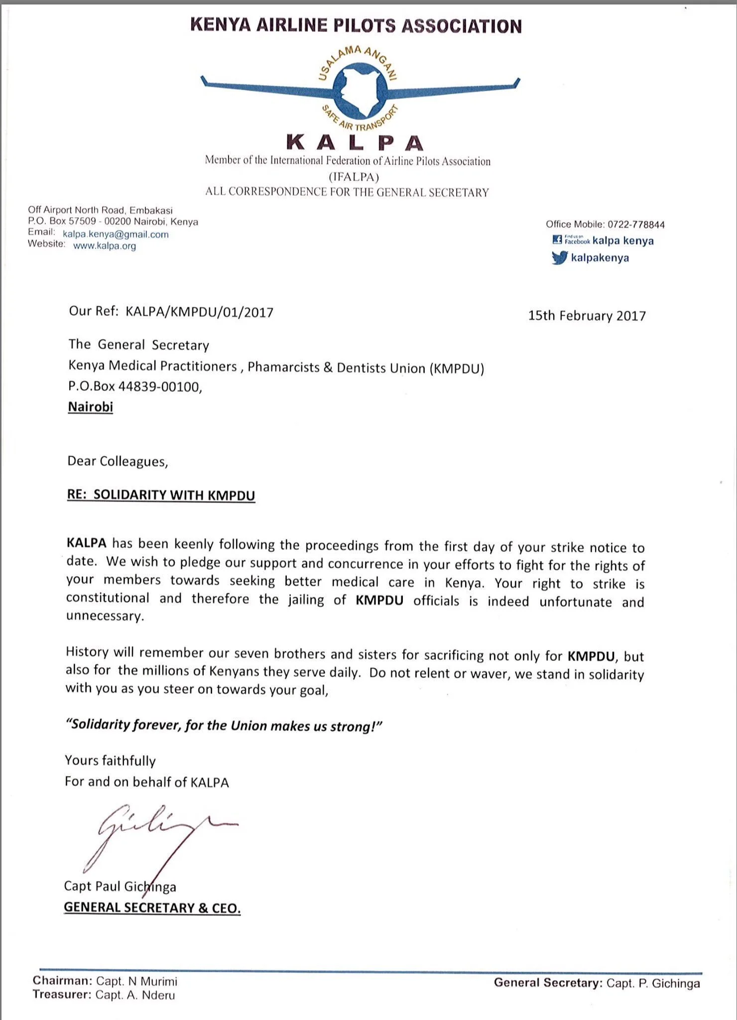 The Kenya Airline Pilots Association (KALPA), umbrella body of pilots flying the national carrier Kenya Airways, today lent their support towards the on-going doctor’s strike, which has rattled the Jubilee regime.