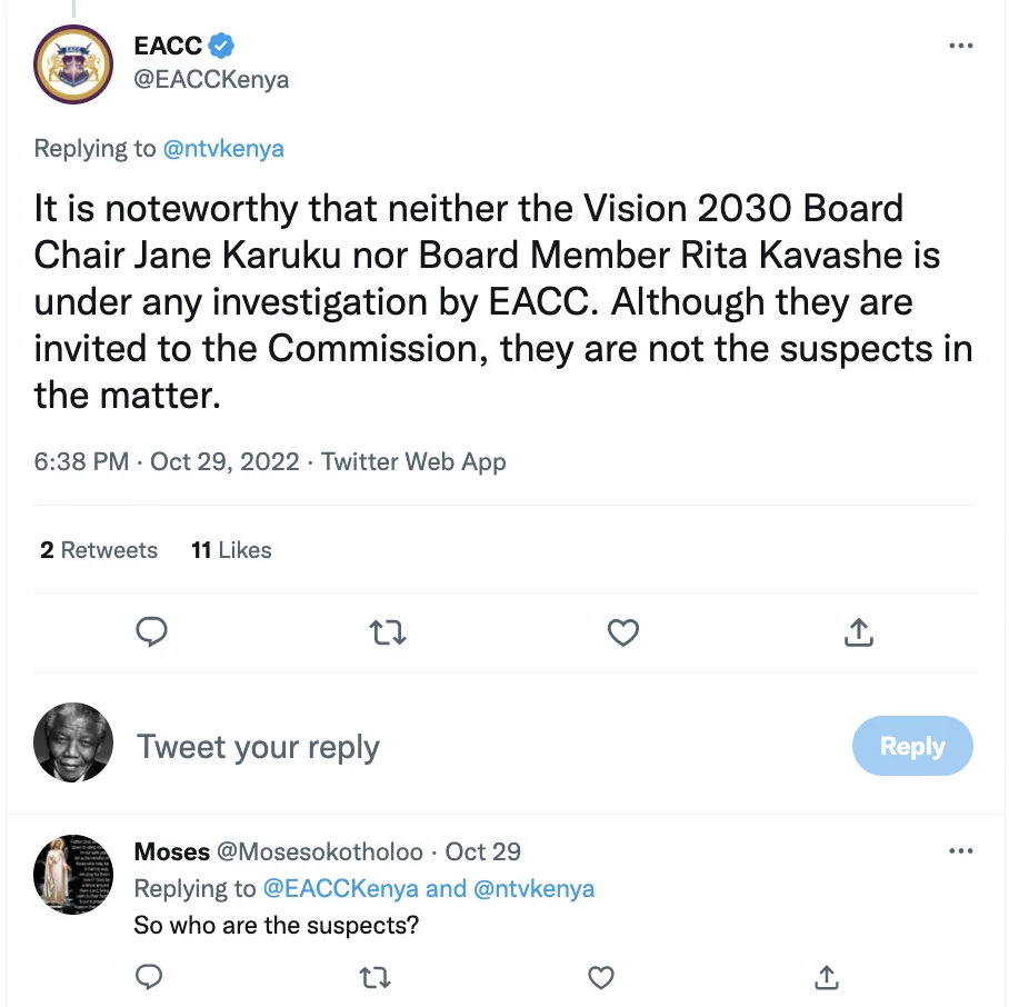 It is believed that Jane Karurku helped cover up the scandal, even as EACC quickly posted to defend her on social media. One Kenyan demanded to know who the suspects of the scam are if not the summoned