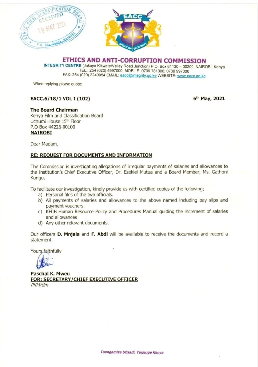 As a result, the letter says, Ezekiel Mutua and Gathoni Kungu are further instructed to provide certified copies of; Their personal files, Payslips and payment vouchers, The KFCB Human Resource Policy and Procedures Manual, among other relevant documents.