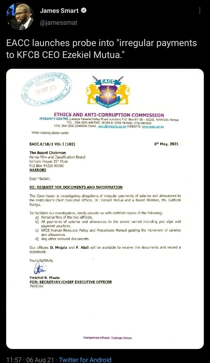 In the document shared by Kenyan Journalist and news anchor James Obuya Smart, EACC requested the KFCB leadership to provide documents and information to help with their investigations on the matter.