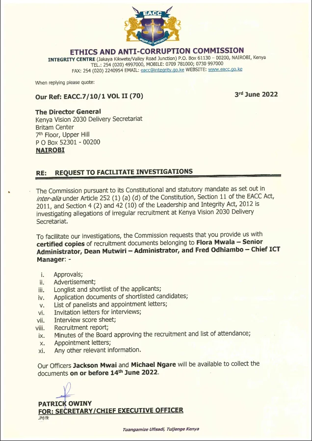 Two months later, in a letter dated 3, June 2022, the Deputy Director of Ethics Compliance at EACC, Dr Patrick Owiny wrote to Mr Mwige, seeking his office to facilitate investigations into allegations of irregular recruitment overseen by his office.