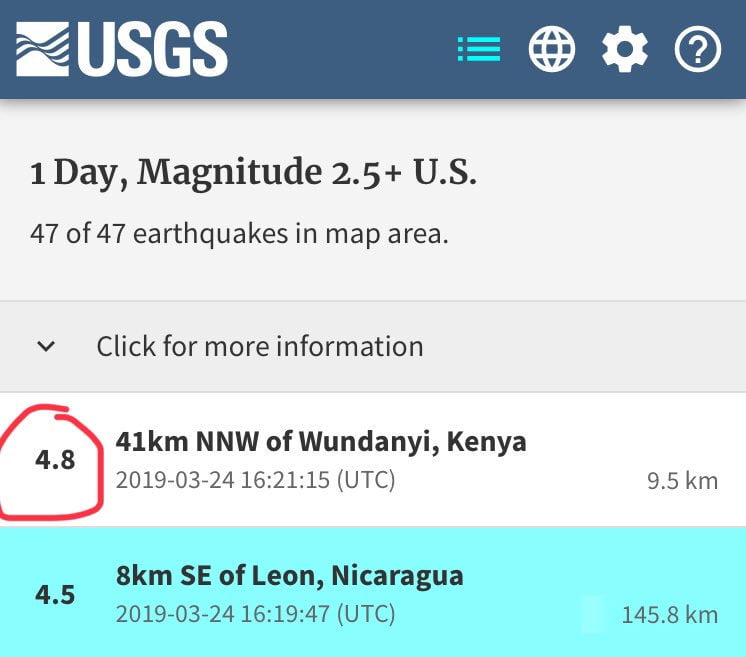 According to the United States Geological Survey, the tremor felt in Nairobi and it’s environs had its epicenter near Wundanyi.