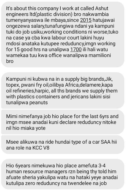 “Tuko na case ya CBA kwa Labour Court lakini huyu mdosi anataka kutupea redundancy. Imagine working for 15 good hours unalipwa Sh1,700 ilhali watu wamekaa tu kwa office wanalipwa mamilioni,” the employee laments.