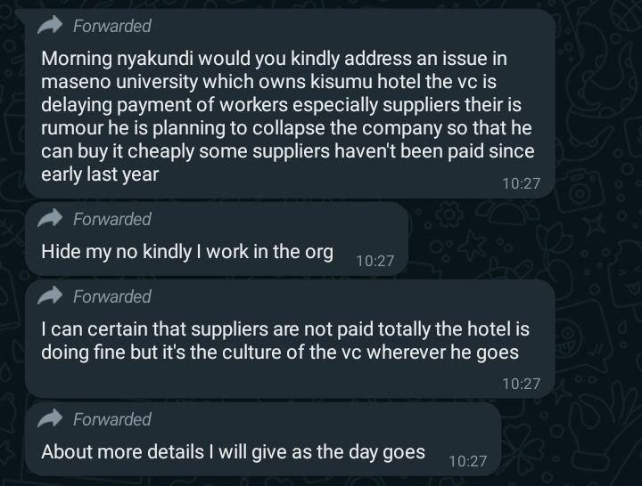 “Good Morning Nyakundi, I would you kindly address an issue in Maseno University which owns Kisumu Hotel.