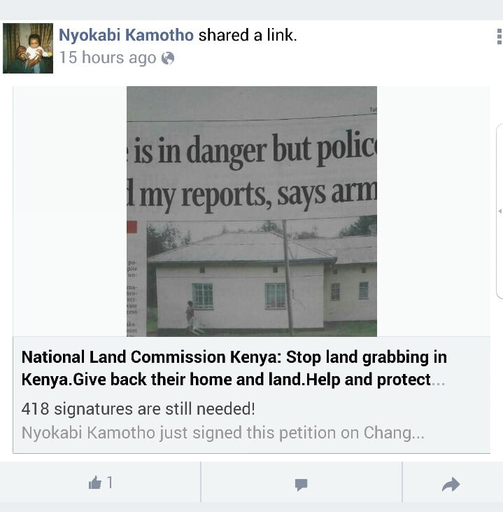 Ironically, Nyokabi has been sharing an online petition against the grabbing of land owned by the family of Dmitry Gwandho, an Army Major, yet she herself is doing the same to others. The hypocrisy is nauseating.