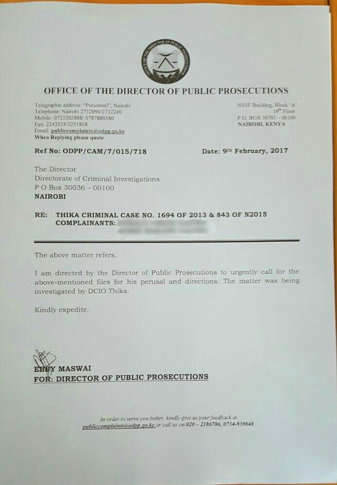 It seems like it's the end of the road for the Thika DCIO as Keriako Tobiko has written directly to Ndegwa Muhoro over the matter, signalling that the Thika DCIO has been removed from the case. Speculation is rife that the same DCIO together with his agents handling the matter, will be transferred to hardship areas like Mandera, for disciplinary measures, like the former OCPD of Embakasi, who colluded with Kiprono Kittony, to attempt the grabbing of a parcel of land on Mombasa Road.