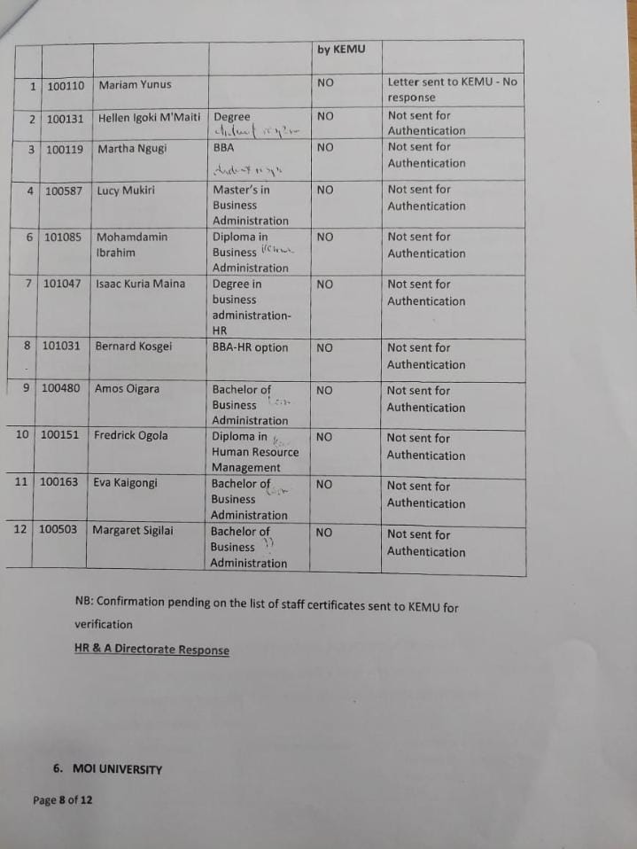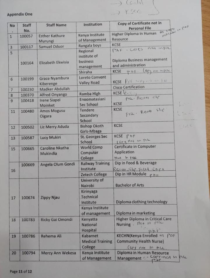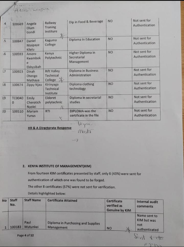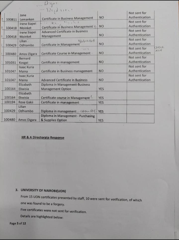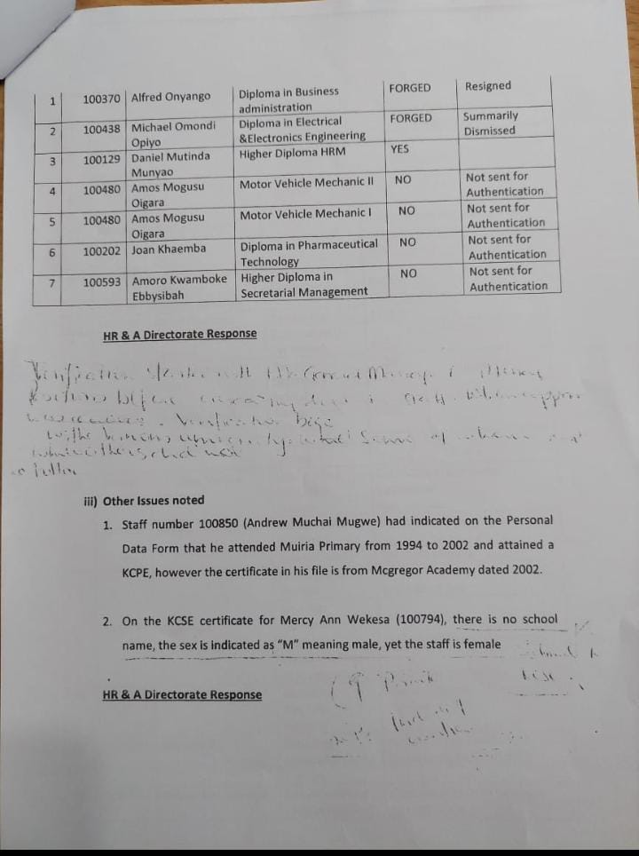Currently, the exercise of verification of academic papers is facing interference Irene Nyaboke and Eng Jared who are out to protect their Kinsmen and cronies, of importance to note is that the Human Resource audit done by the former General Manager is still available and he can witness in a court of law. Irene Onyambu and former GM Human resources and Administration were swiped positions when it become clear that the former GM was out to clear and sue all with fake papers.