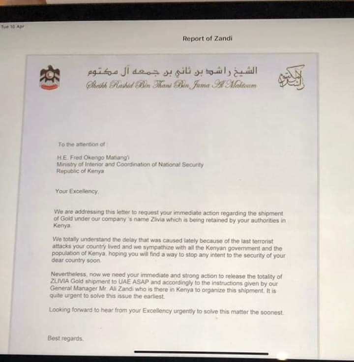 January 24th 2019 – Letter sent from Sheikh Rashid AI Maktoum to H.E Fred Matiangi requesting the speedy release of his goods.(picture attached). No official response is made.
