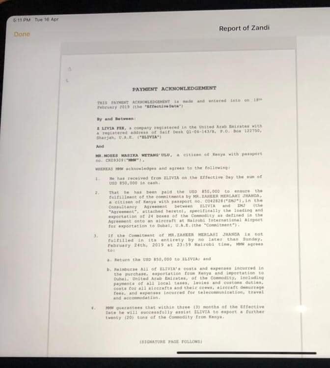 January 2019 – $700, 000 cash paid (at Serena hotel) to Zaheer and Wetangula with the promise of safe return of goods within three (3) days.