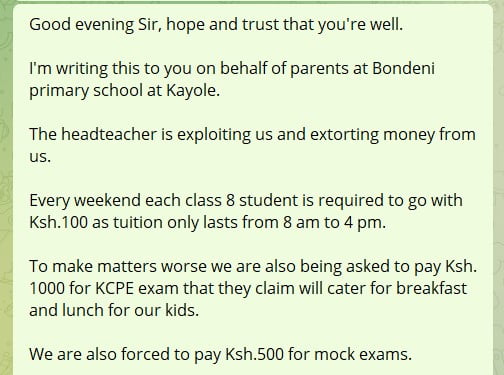 "Good evening Sir, hope and trust that you're well. I'm writing this to you on behalf of parents at Bondeni primary school at Kayole. The headteacher is exploiting us and extorting money from us. Every weekend each class 8 student is required to go with Ksh.100 as tuition only lasts from 8 am to 4 pm. To make matters worse we are also being asked to pay Ksh.1000 for KCPE exam that they claim will cater for breakfast and lunch for our kids. We are also forced to pay Ksh.500 for mock exams," the message reads in part.