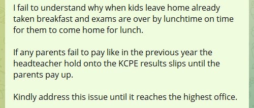 "I fail to understand why when kids leave home already taken breakfast and exams are over by lunchtime on time for them to come home for lunch. If any parents fail to pay like in the previous year the headteacher hold onto the KCPE results slips until the parents pay up. Kindly address this issue until it reaches the highest office," the parent finishes off.