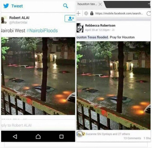 Caption : Fake photo posted by Twitter Grandpa Alai to stay relevant. Photo was not from Nairobi West but from Houston. Kenyans from all walks of life are now calling for the retirement of Robert Alai, after he posted a fake photo depicting Houston Texas as Nairobi West, in a bid to dramatise the flooding in Nairobi an