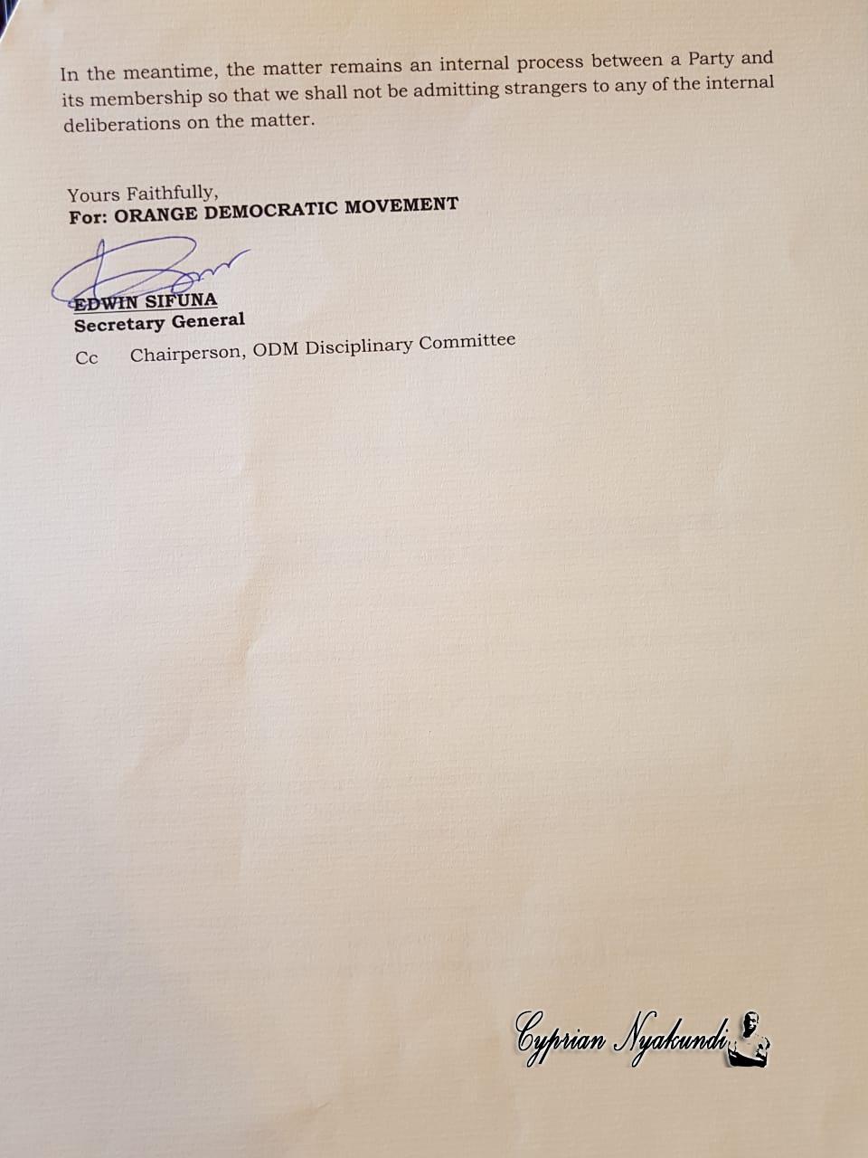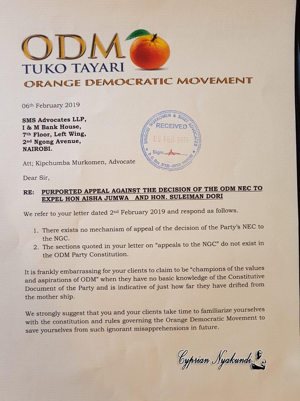 The Orange Democratic Movement has officially sent a response to Kipchumba Murkomen and his two clients Aisha Jumwa and Suleiman Dori following their “appeal” against the party's decision to expel the two. https://twitter.com/kipmurkomen/status/1092864722985275392?s=19 https://twitter.com/kipmurkomen/status/10928699