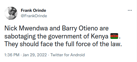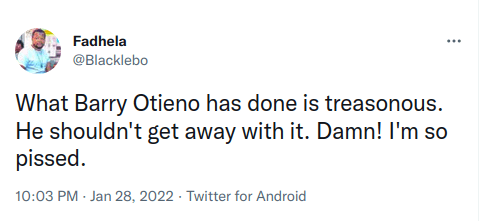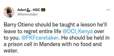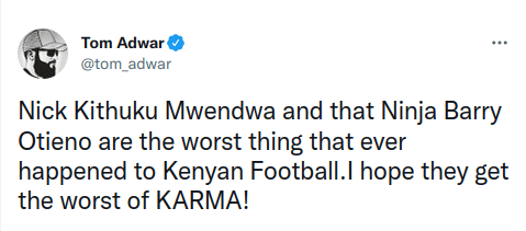 “Nick Kithuku Mwendwa and that ninja Barry Otieno are the worst thing that ever happened to Kenyan Football, I hope they get the worst of KARMA,” former Tusker midfielder Tom Adwar wrote.