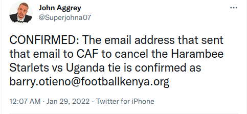The letter which was sent via Barry Otieno’s e-mail address ([email protected]) subsequently led to the premature cancellation of the match between the Starlets and The Crested Cranes who were set to face each other in mid-February this year.
