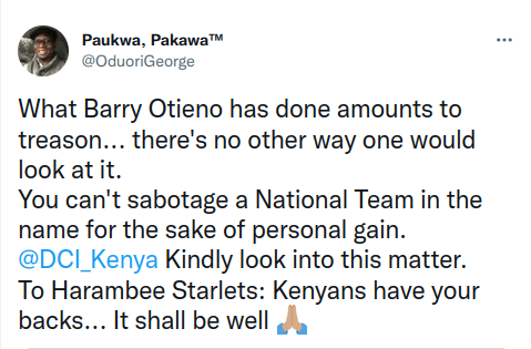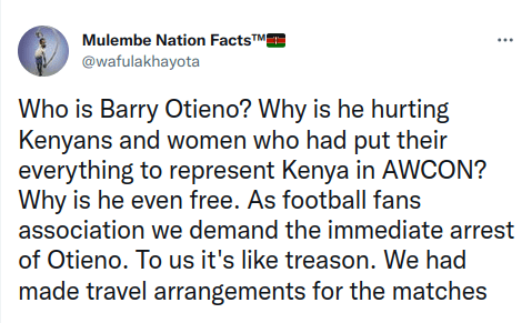 Enraged football fans have called for the arrest of disbanded Football Kenya Federation (FKF) ex-CEO Barry Otieno for his role in the treasonous crime of sabotaging the national women’s football team fondly known as “Harambee Starlets”.