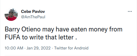 While some have expressed suspicion that Mr Otieno could have been compromised by corrupt Federation of Uganda Football Associations (FUFA) officials into drafting the letter, most have insisted that he was acting on behalf of disgraced former President Nick Mwendwa.