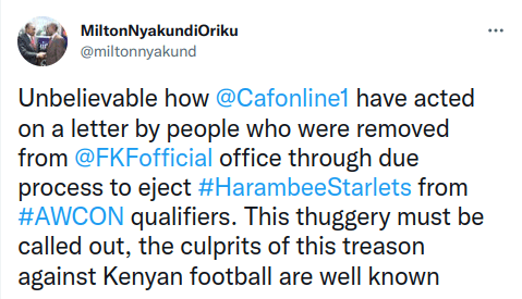 “Unbelievable how CAF have acted on a letter by people who were removed from the FKF office through due process to eject Harambee Starlets from AWCON qualifiers. This thuggery must be called out, the culprits of this treason against Kenyan football are well known,” opined accomplished sports journalist Milton Nyakundi.