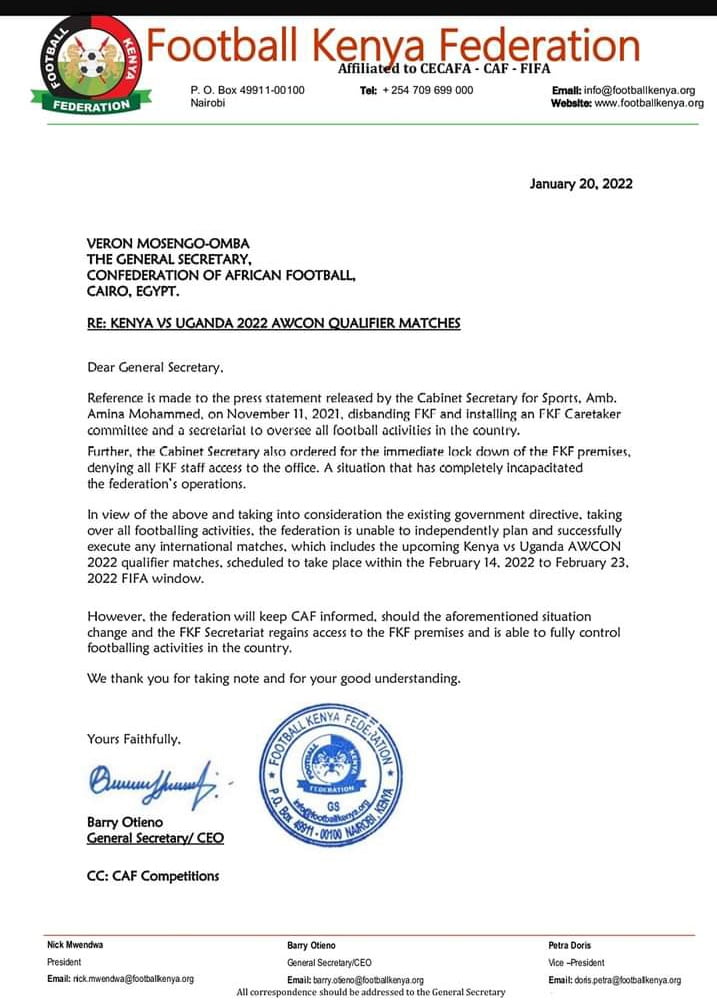“Taking consideration of the existing government directive, taking over all football activities, the federation is unable to independently plan and successfully execute any international matches, which includes upcoming Kenya vs Uganda AWCON 2022 qualifier matches, scheduled to take place within February 14, 2022, to February 23, 2022,” Otieno wrote in part of the letter.