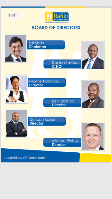 Former Chase Bank chairman Mohammed Zafrullah Khan is still the chairman of Rafiki Microfinance, an internal source has whispered to us. Zafrullah Khan was charged with conspiring to defraud Chase Bank of Sh1,683,000,000, in the year 2017.