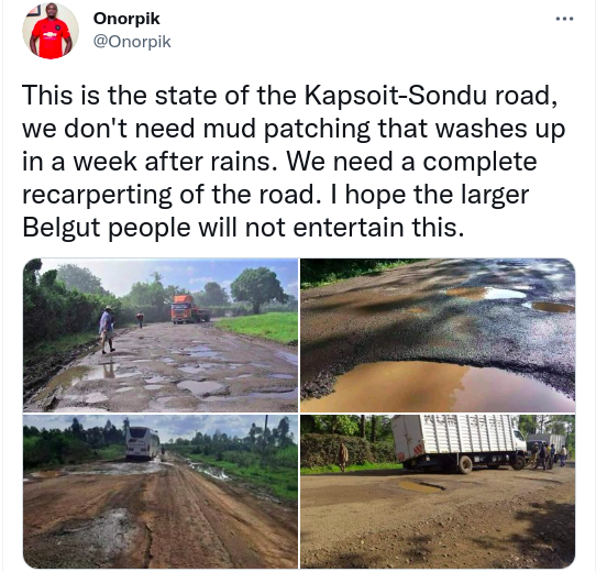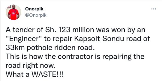“A tender of Sh. 123 million was won by an “Engineer” to repair Kapsoit-Sondu road of 33km pothole-ridden road. This is how the contractor is repairing the road right now,” the angry netizen began in his long Twitter thread, adding, “We need a complete recarpeting of the road. I hope the larger Belgut people will not entertain this.”