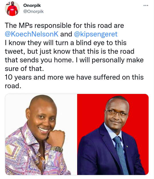 Ironically, Belgut MP Nelson Koech and his Sigowet counterpart Bernard Kisperenget both use the road to commute home.