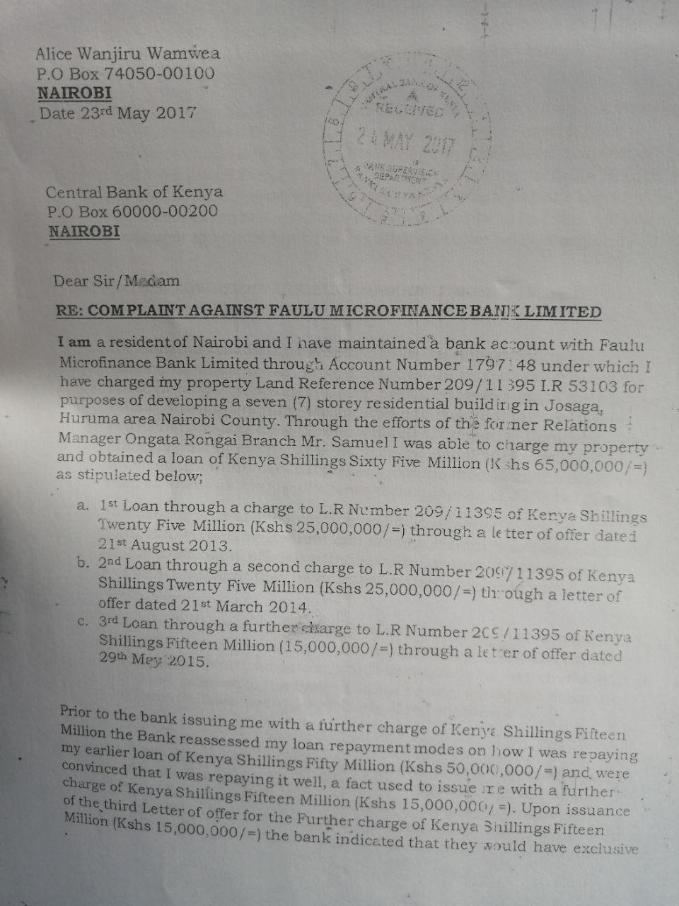 Alice Wanjiru Wamwea approached Faulu Bank for financing her construction projects in 2013, 2014 and 2015. She started with Kshs. 2 million, 25 million and 50 million. The security of her loans is her multimillion property in Huruma Nairobi.
