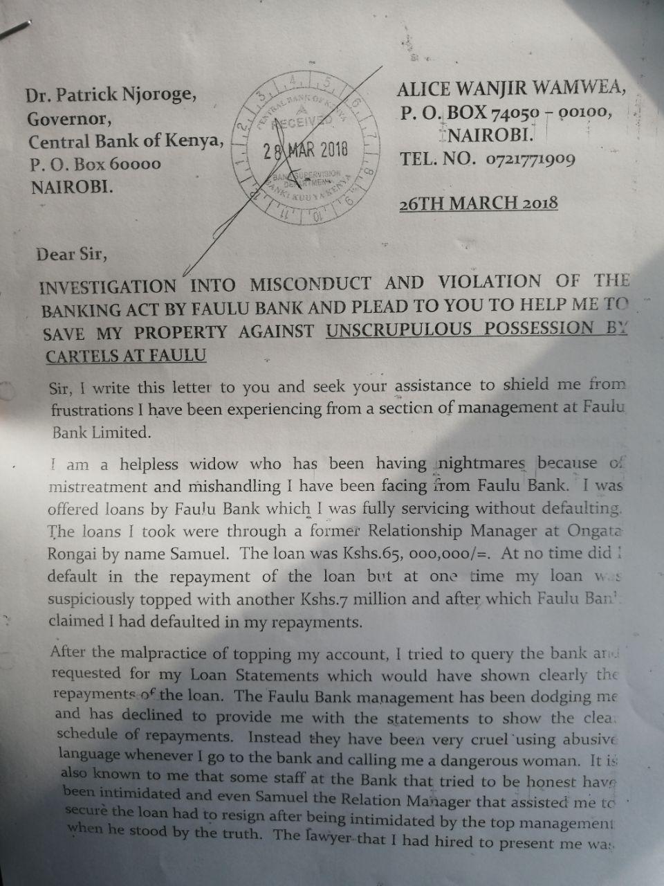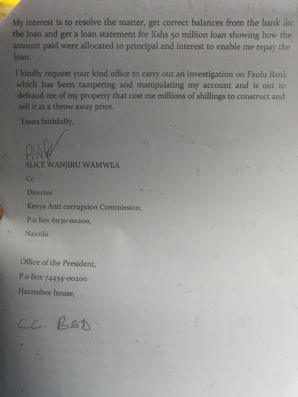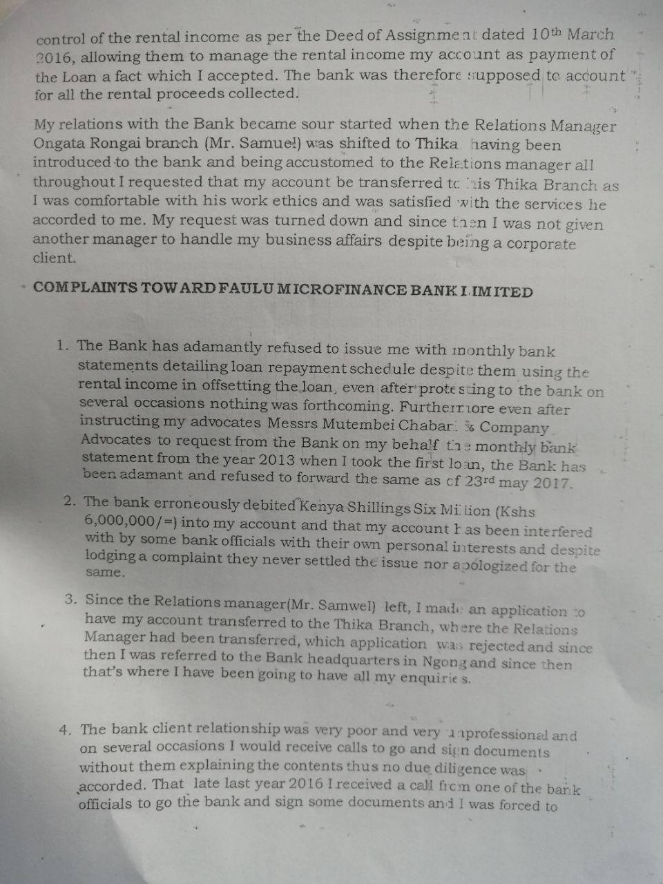 Being the good customer, she was to Faulu her access to finance was smooth until some bank officials crafted a scheme when she got the Kshs. 50 million loan. Her problems started when she was first denied her own loan statement.