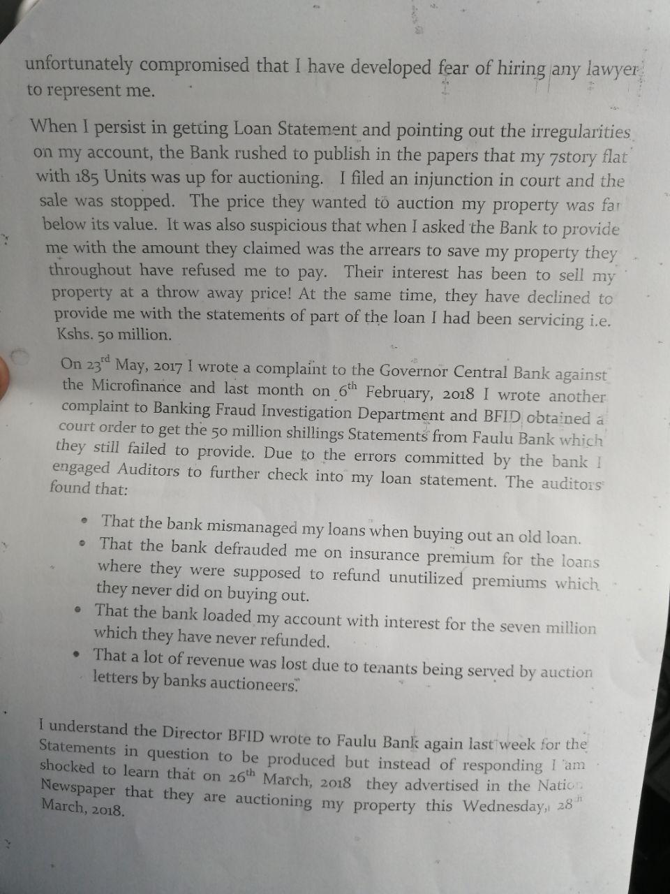 When Faulu Bank refused to give her the statement, being a seasoned business lady, she knew something was not right and rushed to Cooperative bank and borrowed Kshs. 64 million which she got an offer letter. On taking the offer letter to Faulu, they corrupted the security transfer process to Cooperative Bank and listed her in Credit Reference Bureau (CRB), in a bid to deny her a chance to ever get any loan; this particular one was geared towards her not getting the Cooperative Bank financing.