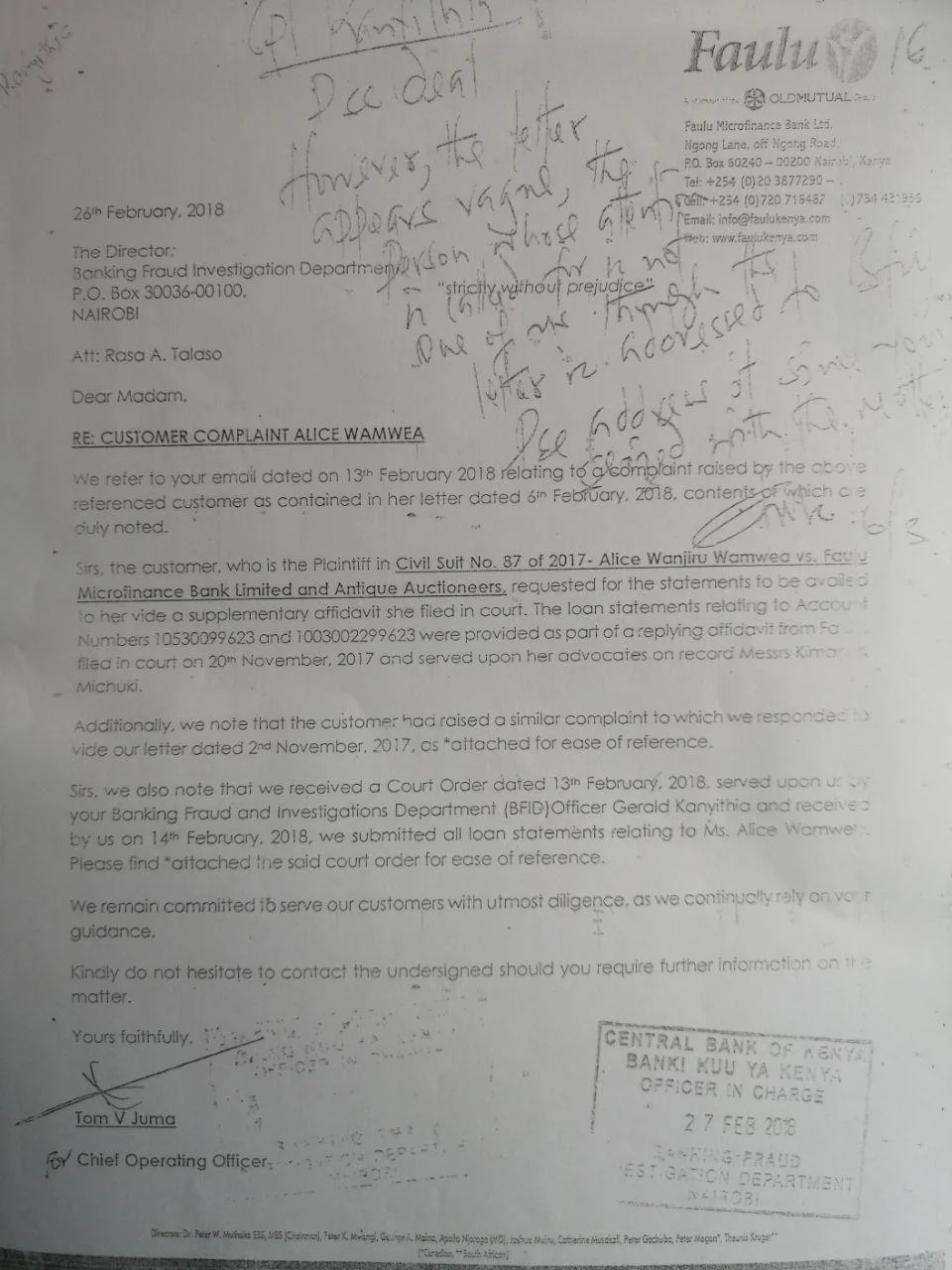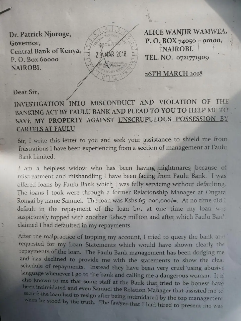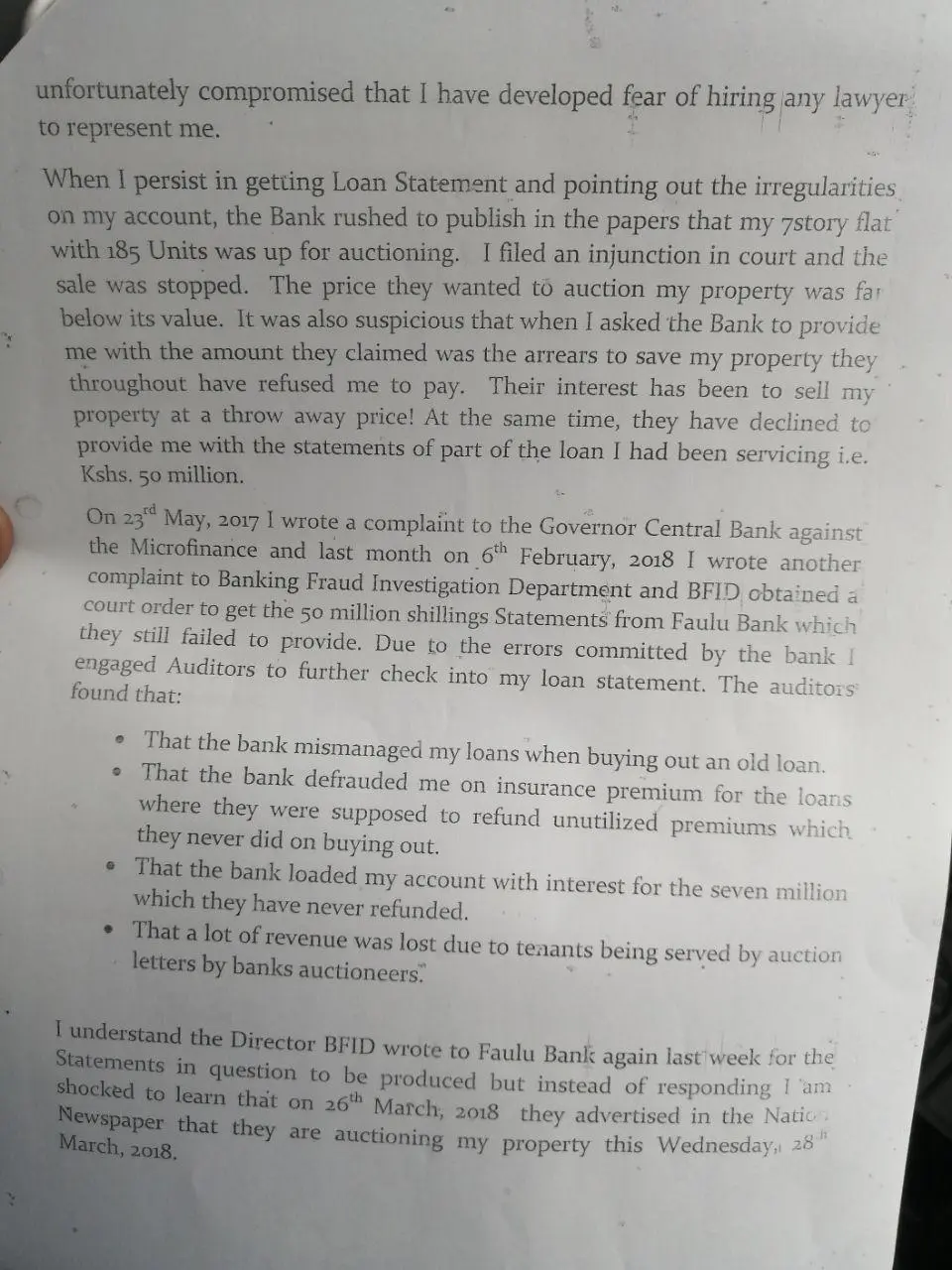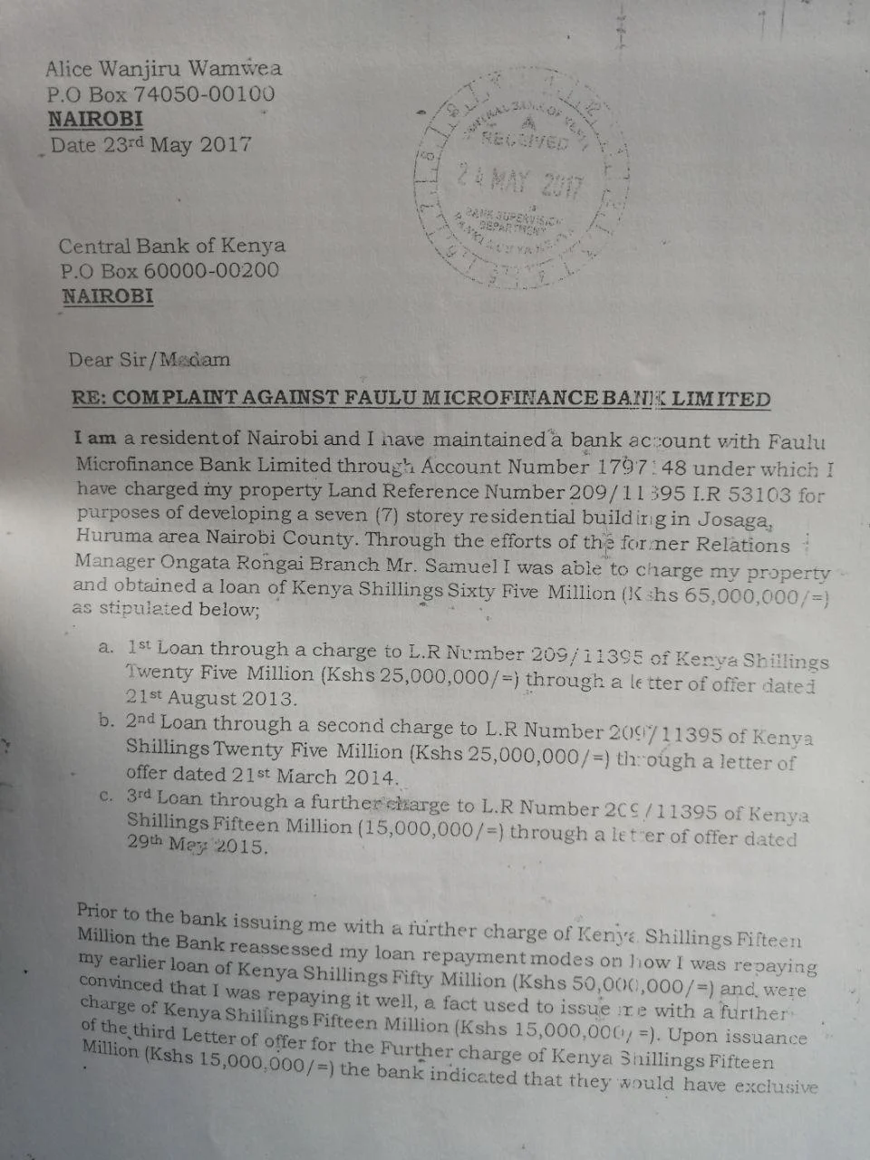 Being the good customer, she was to Faulu her access to finance was smooth until some bank officials crafted a scheme when she got the Kshs. 50 million loan. Her problems started when she was first denied her own loan statement.