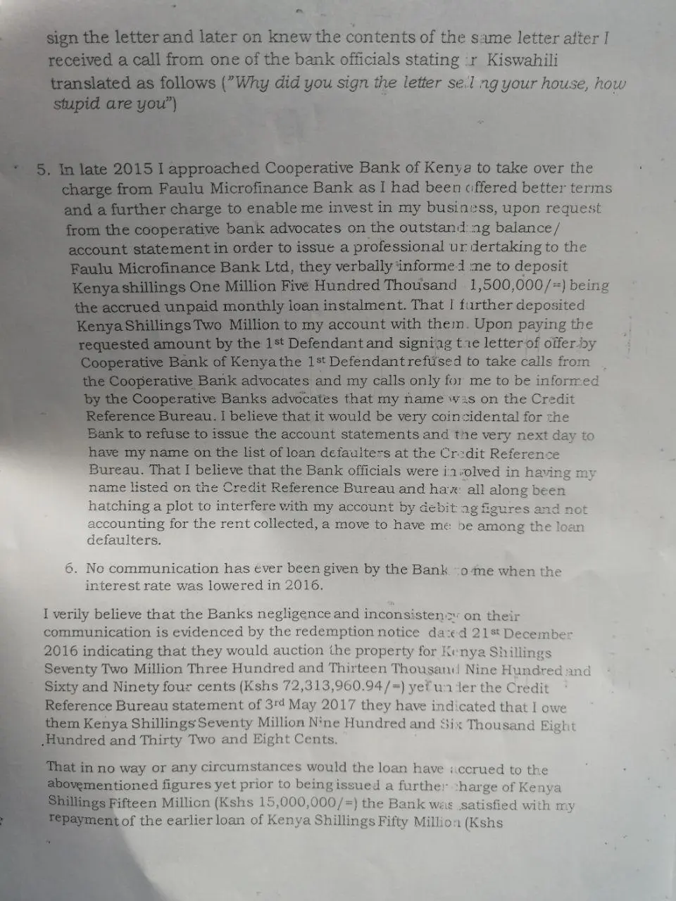 When Faulu Bank refused to give her the statement, being a seasoned business lady, she knew something was not right and rushed to Cooperative bank and borrowed Kshs. 64 million which she got an offer letter. On taking the offer letter to Faulu, they corrupted the security transfer process to Cooperative Bank and listed her in Credit Reference Bureau (CRB), in a bid to deny her a chance to ever get any loan; this particular one was geared towards her not getting the Cooperative Bank financing.