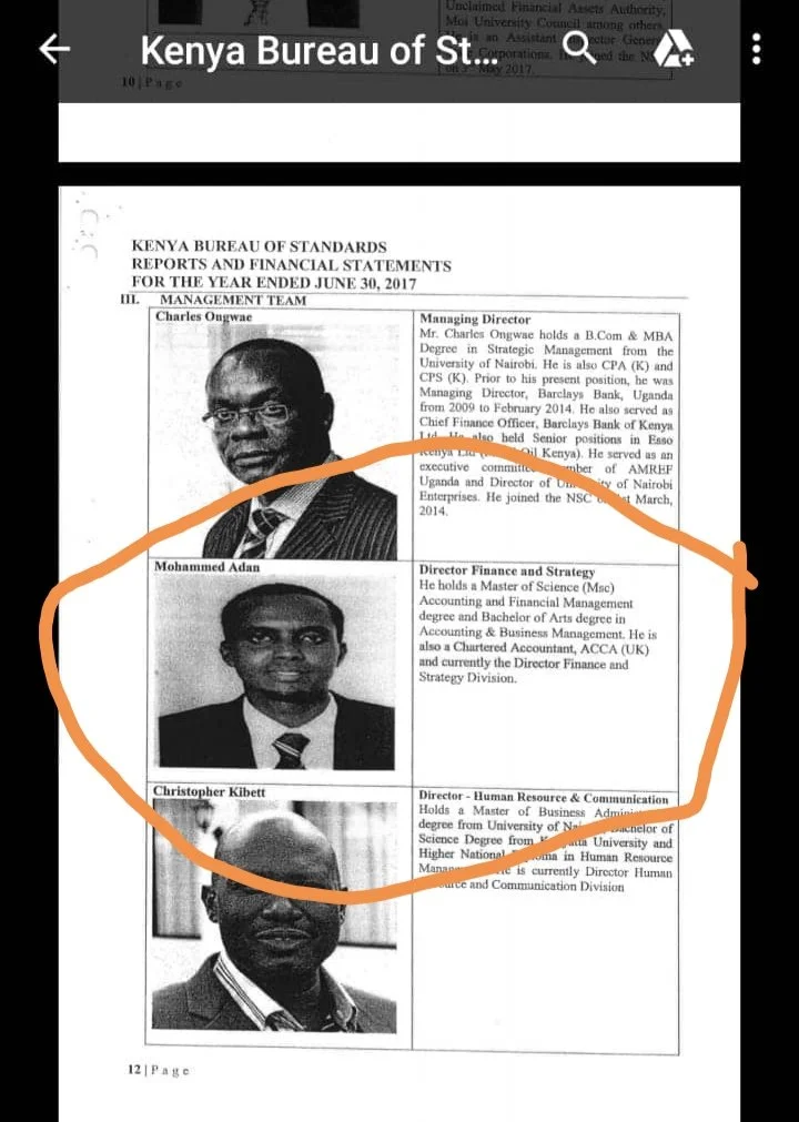 Kenya Bureau of Standards (KeBS) Director for Finance and Strategy Mr. Mohamed Ahmed Adan is in possession of dual citizenship of Kenya and Britain.