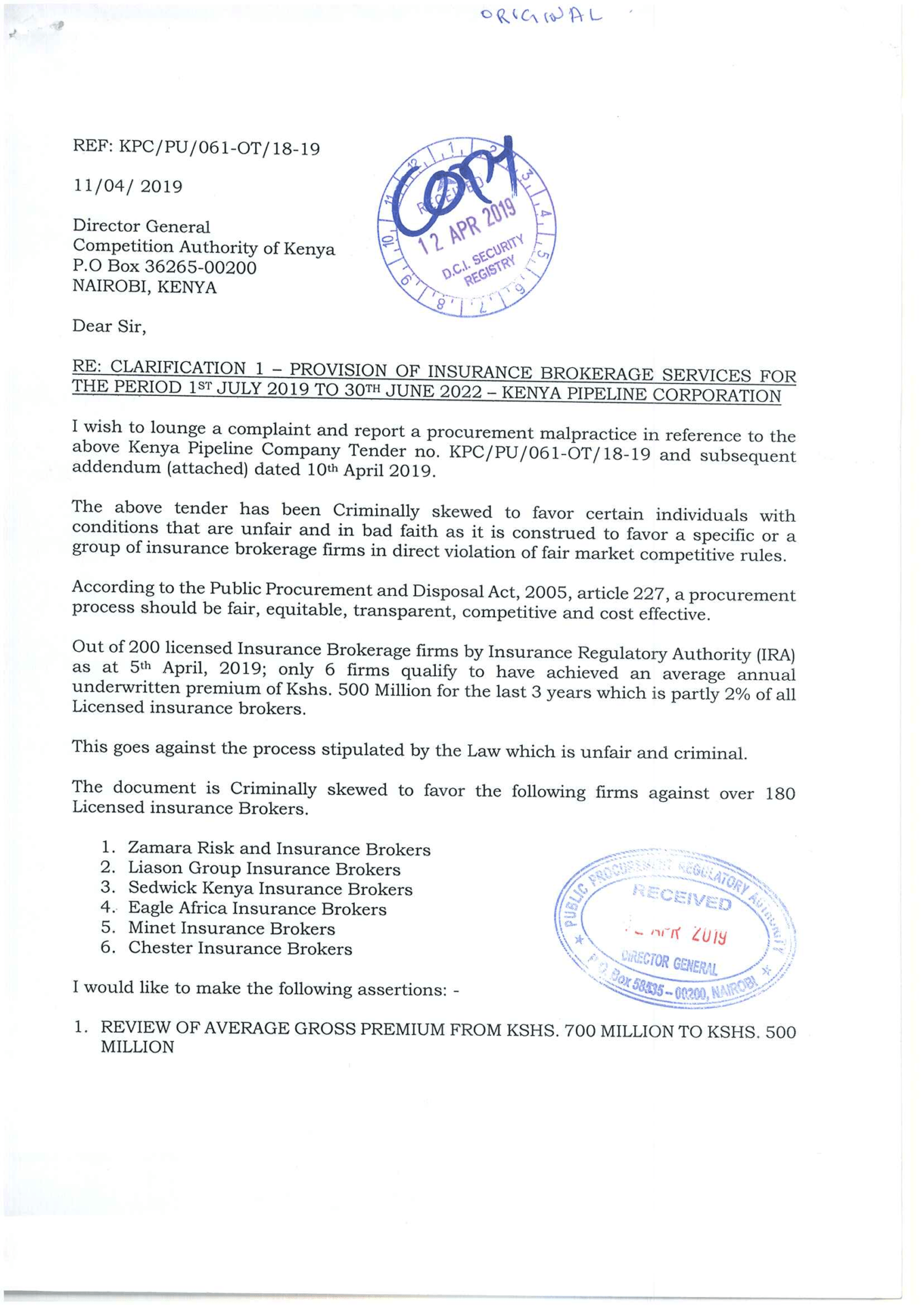 Out of 200 licensed insurance brokerage firms in Kenya, only the above named firms qualifies to have attained mandatory Kshs. 500 Million per annum turnover in the immediate previous 3 years ( i.e 2018, 2017, 2016 ). The intention is to limit the competition as much as possible. The current MD is called Maureen Mwenje and we can only conclude that she has a personal interest in this tender. Through our umbrella body AIBK we formally requested that the Kshs. 500 million threshold to be reviewed downwards to Kshs. 200 Million. KPC is highly infested with corruption and unfair market competitive rules imposed to lock out competent firms.