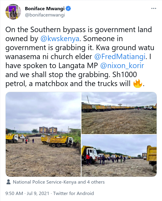 "On the Southern bypass is government land owned by KWS. Someone in government is grabbing it. Kwa ground watu wanasema ni church elder Fred Matiangi," he wrote on his Twitter page.