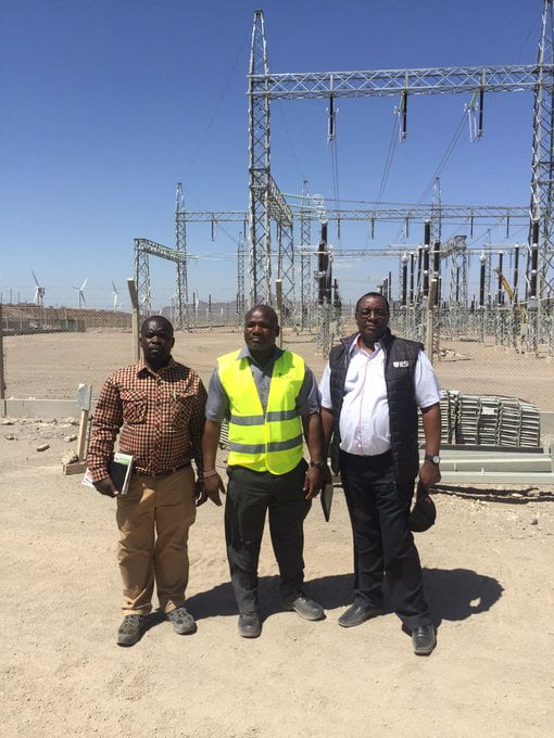 FCPA Fernandes Barasa (m), Mr. Duncan Macharia (r) & Eng. Anthony Wamukota at Loiyangalani substation,part of the Loiyangalani-Suswa project