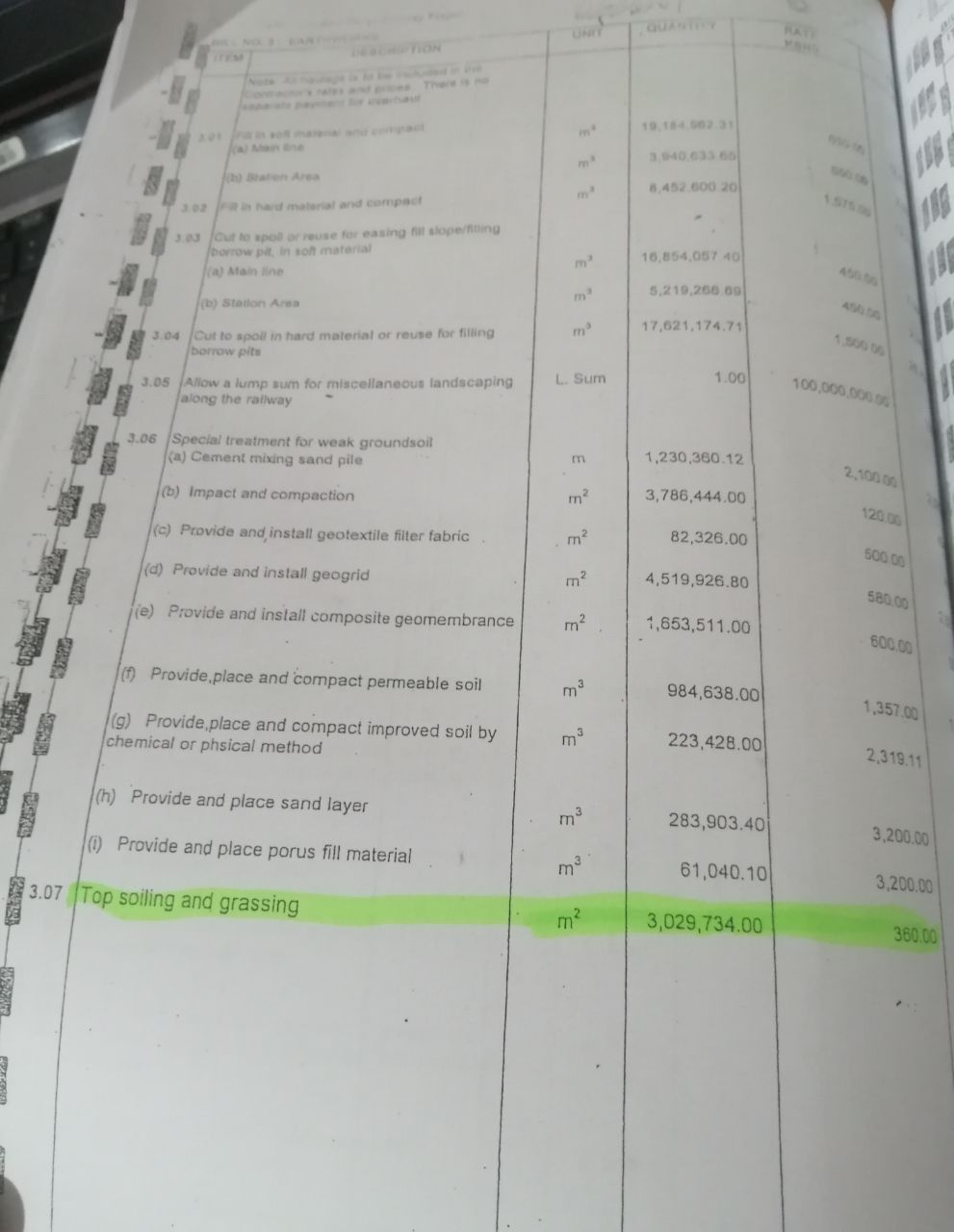 Well, on Section 7, also titled Non-Binding Bill of Quantities, the first page shows the description of the entire page and their costing to be preliminary and supervisory/support services, site clearance and topsoil stripping, earthworks, protection work for railway and structure, culverts and drainage works, passage of traffic, temporary work and structure, bridge works, track laying work, and finally building of railway station, management office and subsidiary house.