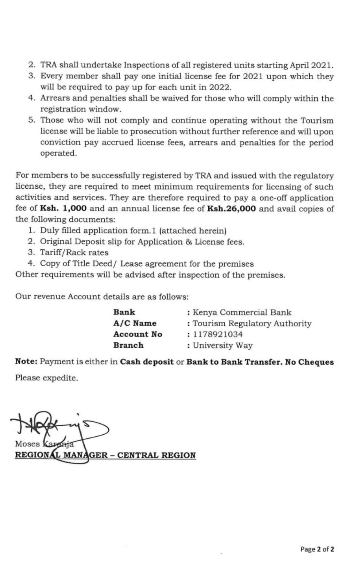 Additionally, they shall require a NEMA license, a Single Business Permit, Home Insurance, 1% Digital Service Tax, 2% Catering Levy and 16% VAT plus 30% Corporate Tax because the enterprise must now operate as a Limited Company.