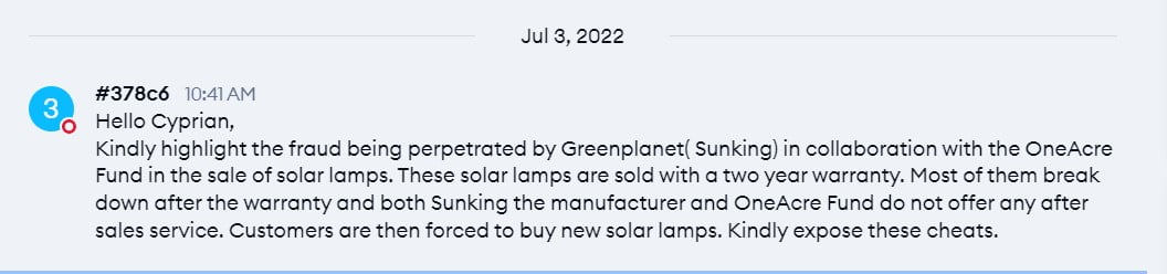 Kindly highlight the fraud being perpetrated by Green Planet Kenya (Sun King) in collaboration with the One Acre Fund in the sale of solar lamps.
