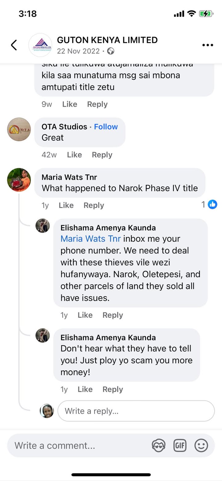 "Good evening Cyprian, I have an issue that I would like you to bring to light about a company selling land but doesn’t want to issue titles. When asked, they take buyers in circles and even stop picking calls. How do I go about it? How much do you charge for that? Please advise.According to its profile, Guton Kenya Limited was established in 2004 and operates from Solar House, Harambee Avenue, Nairobi. The company offers real estate services, including land transactions, property management, consultancy, and landscaping. It is led by Chairman Daniel Omari and CEO Philip Manoti.Guton Kenya Limited is located at Solar House, 7th floor. I purchased the land in 2011 and was allowed to pay in installments, which I completed in 2020, and I paid even the title fee. But up to now, they have not issued me with a title, and every time I call them, they ignore my calls. Many people have suffered at the hands of this company with empty promises. I have followed up until I have given up. Kindly hide my identity."
