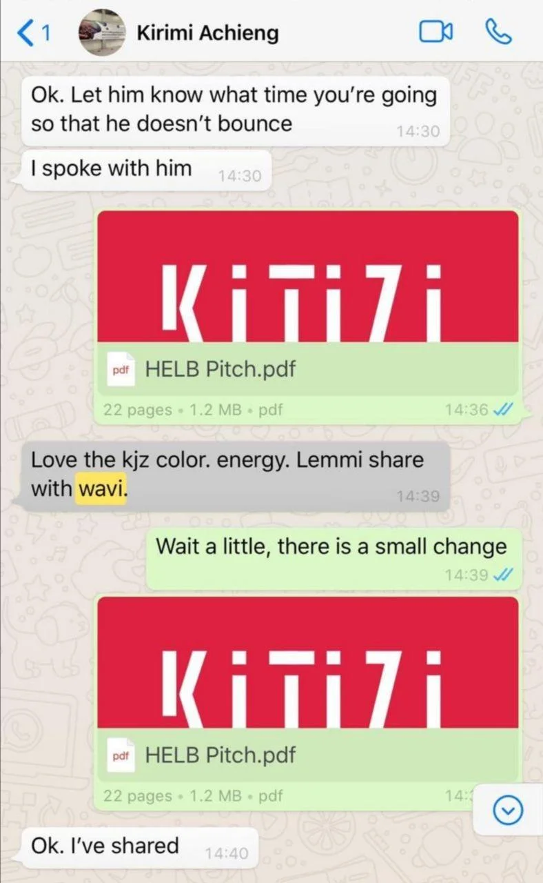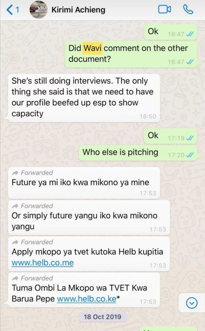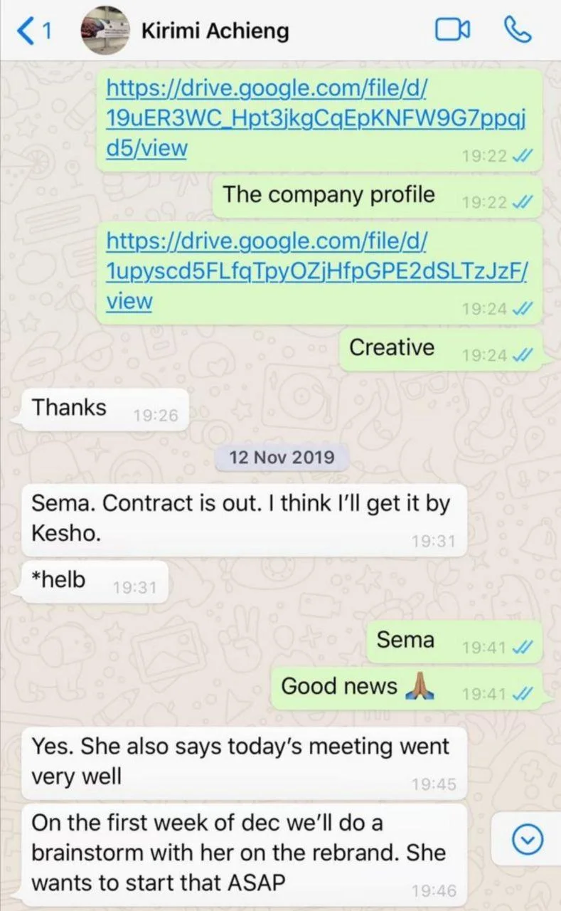 Kirimi from Kijizi, another ad agency she owns, even sends the presentation to Wavi Muigai, HELB and even gets feedback.