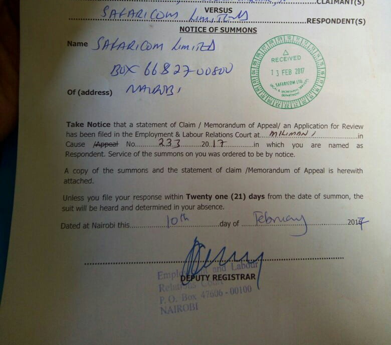 The Case has been filed in the Employment and Labor Relations court at Milimani Law Courts Cause No 233 of 2017.