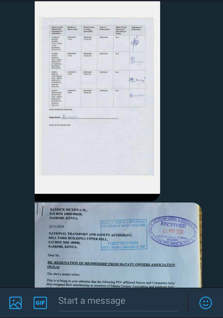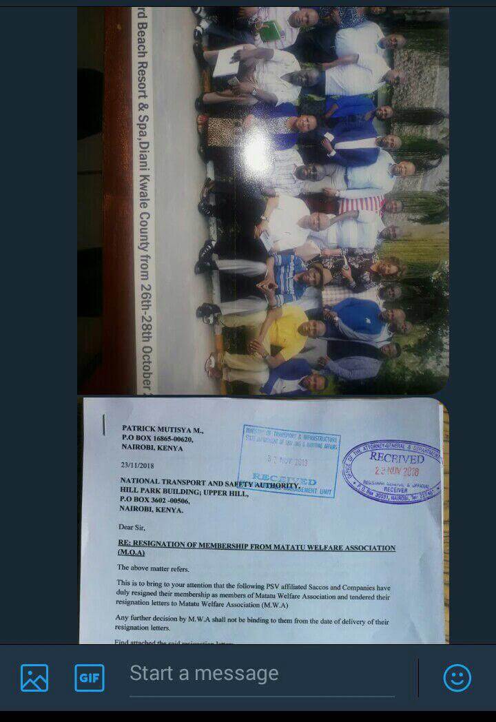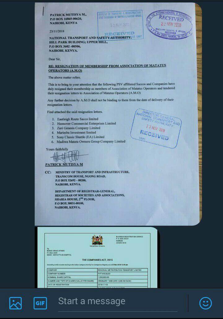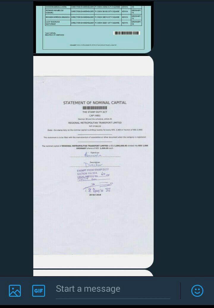 Hi Nyakundi, An illegal limited company Regional Metropolitan Transport Limited was created by 16 directors named in the documents below to terrorize Matatu operators and the commuters plying Nairobi routes. They met at Leopard Beach Resort and Spa in Diani, Kwale county from the 26th to 28th October to form this gro