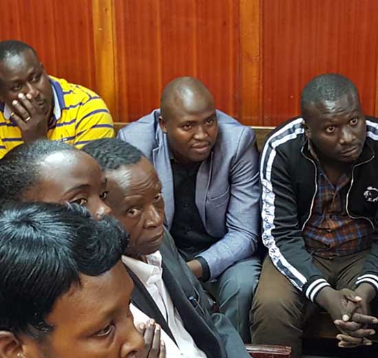 Joseph Waswa, Duncan Muchai, Isaac Wajekeche, William Simiyu, David Luganya, Gilbert Kirunja, and Anthony Wafula were taken to court on Monday after they defrauded a Nairobi based businessman by pretending to be Uhuru Kenyatta and initiating his voice. The group which was arrested by DCI detectives during the weekend