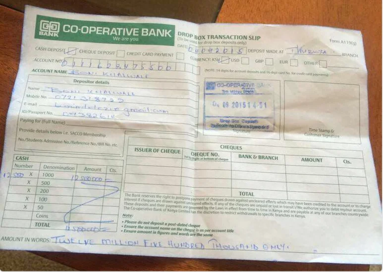 For now, whether he received it or not, Khalwale needs to go back to the drawing board to undo the damage that has been done. He needs to verify if the receiving cashier stamp is genuine, whether mobile number 0721318722 is his and the email address on the bank slip is indeed his too.