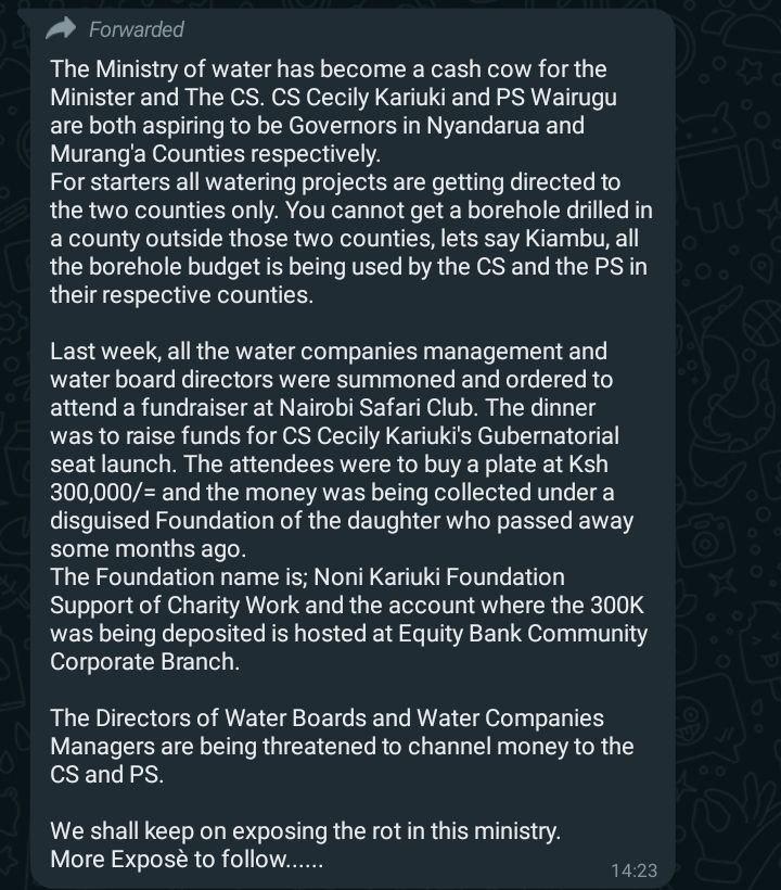 “Hi Nyakundi, the Ministry of water has become a cash cow for the Minister and The CS.