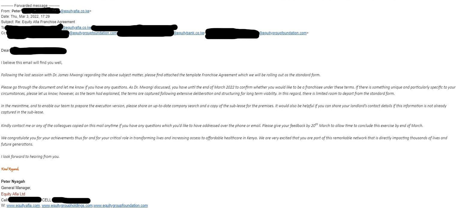 7. Some of the doctors I spoke to informed me that part of the funds they used for setting up came from loans and/or finance from family members, in the unfortunate demise of the said doctors, none of their next of kins can acquire the business, etc, the business automatically reverts to equity Afya, which is a rather bizarre arrangement, considering some of these next of kin have actually contributed to these businesses.