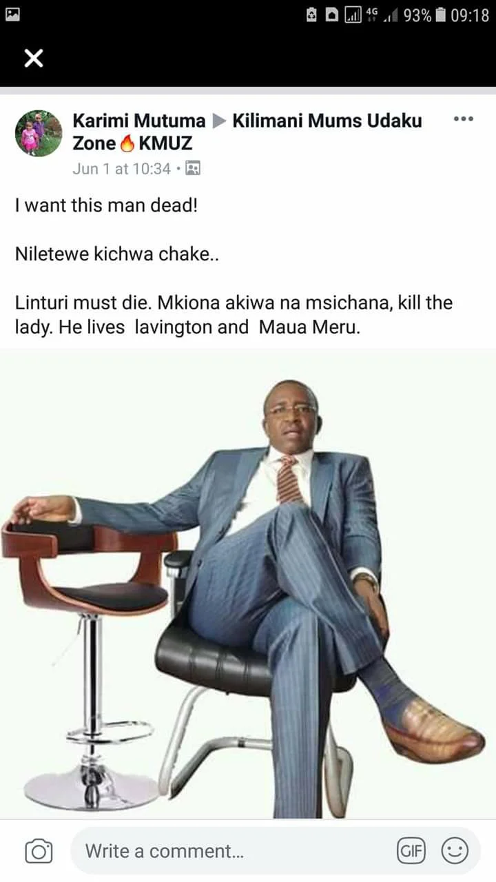 Meru Senator Mithika Linturi looks like he’s in some deep baby mama shit. Screenshots of his purported ex-lover sending death threats to the former Imenti South Member of Parliament have been doing rounds on social media.